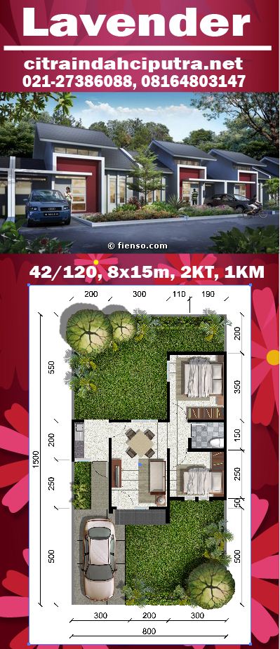 Lavender 42/120 (8x15) dipasarkan 1 Agustus 2013. 2KT, 1 Dapur. Carpot, Double wall. Kloset duduk. Kini per tanggal 30 Oktober 2013 dibuka blok baru di AC.09. Lokasi strategis, maih banyak pilihan, segera hubungi fienso.